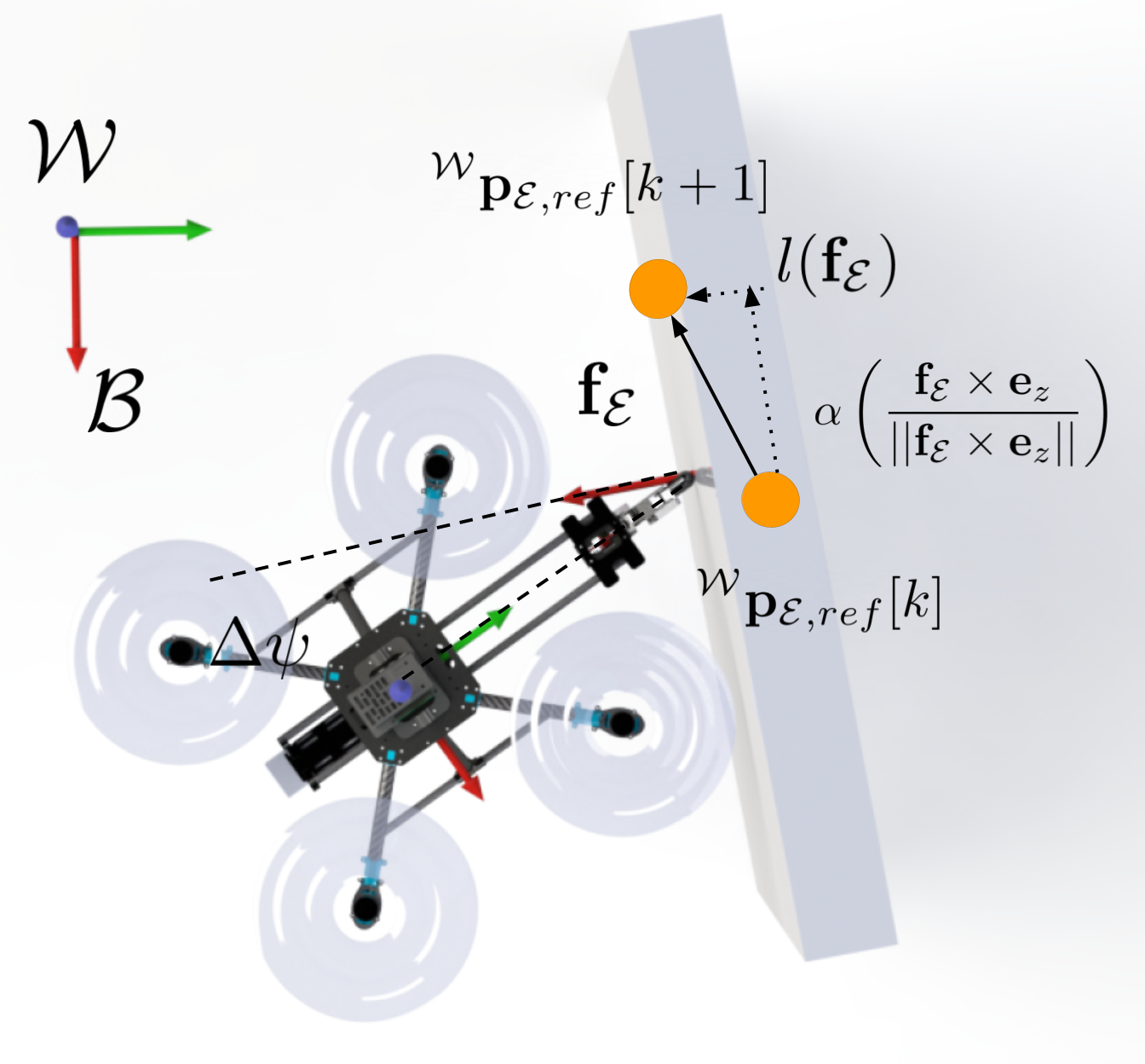 Thanks to the quasi-static assumption we can infer the local surface normal directly from the contact force estimated from the interaction tool displacement. As pictured to the left, we generate new reference positions by moving the last reference position orthogonal to the surface normal, while also regulating the distance to the surface to stay within a certain force threshold. I.e. $$ \begin{align} \mathbf{p}_{\mathcal{E},\mathrm{ref}}[k+1] &= \mathbf{p}_{\mathcal{E},\mathrm{ref}}[k]+ \alpha\frac{\hat{\mathbf{f}}_\mathcal{E}\times\mathbf{e}_z}{||\hat{\mathbf{f}}_\mathcal{E}\times\mathbf{e}_z||} + \mathit{l}(\hat{\mathbf{f}}_\mathcal{E})^\mathcal{B}\mathbf{e}_{y} \end{align} $$