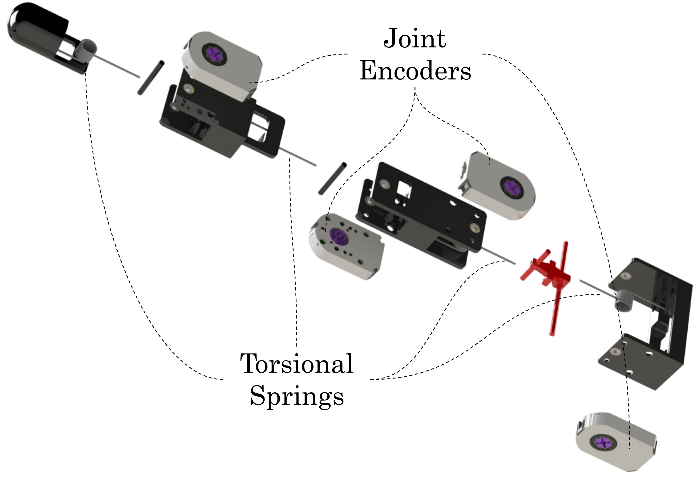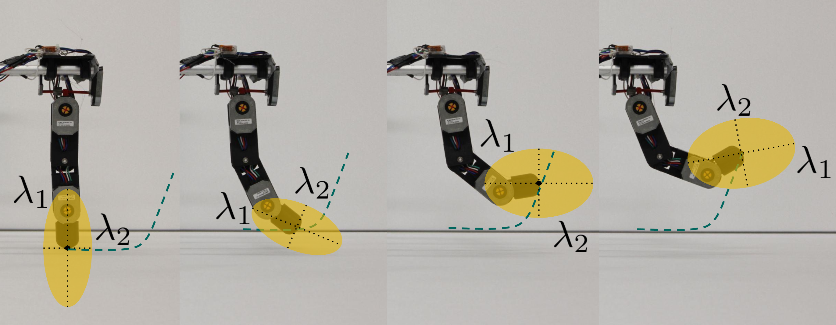One of the contributions of this work is in the novel, bespoke design of a human-inspired robotic finger conceptualized for the proposed aerial tactile task, that allows for precise adjustment of its Cartesian stiffness, as well as a complete 3D force estimation. This feature is vital for handling arbitrary environmental orientations and shapes, making it crucial for the task of environment following. The modeling of the robotic finger operates under two key assumptions: while in contact, the base is moving slowly, and the dynamic coupling of the robotic finger and the base is negligible. In other words, the system operates under quasi-static conditions \(\dot{\mathbf{\zeta}} \simeq 0\) and\(\ddot{\mathbf{\zeta}} \simeq 0\) and the disturbance of the external force onto the base and is near zero \(||\mathbf{J}_{\mathcal{B},\mathcal{E}}^T \mathbf{f}_\mathcal{E}|| \simeq 0\). The interaction tool exhibits joint stiffness, thanks to the rotational springs pre-tensioned at each joint. Therefore, by measuring the displacement of the joints from its nominal positions we can infer the external force acting at the end-effector via the Moore-Penrose inverse of the equations of motion: $$ \begin{align} \mathbf{f}_\mathcal{E} = \mathbf{J}_\mathcal{E}^{T,\dagger}(\mathbf{\xi})\big(\mathbf{G}_\mathcal{E}(\mathbf{\xi},^\mathcal{W}\mathbf{\Omega}_\mathcal{B}) + \mathbf{K}_\mathcal{E}\mathbf{\xi} - \mathbf{A}_\mathcal{E}\tau_\mathcal{E}\big) \end{align} $$
