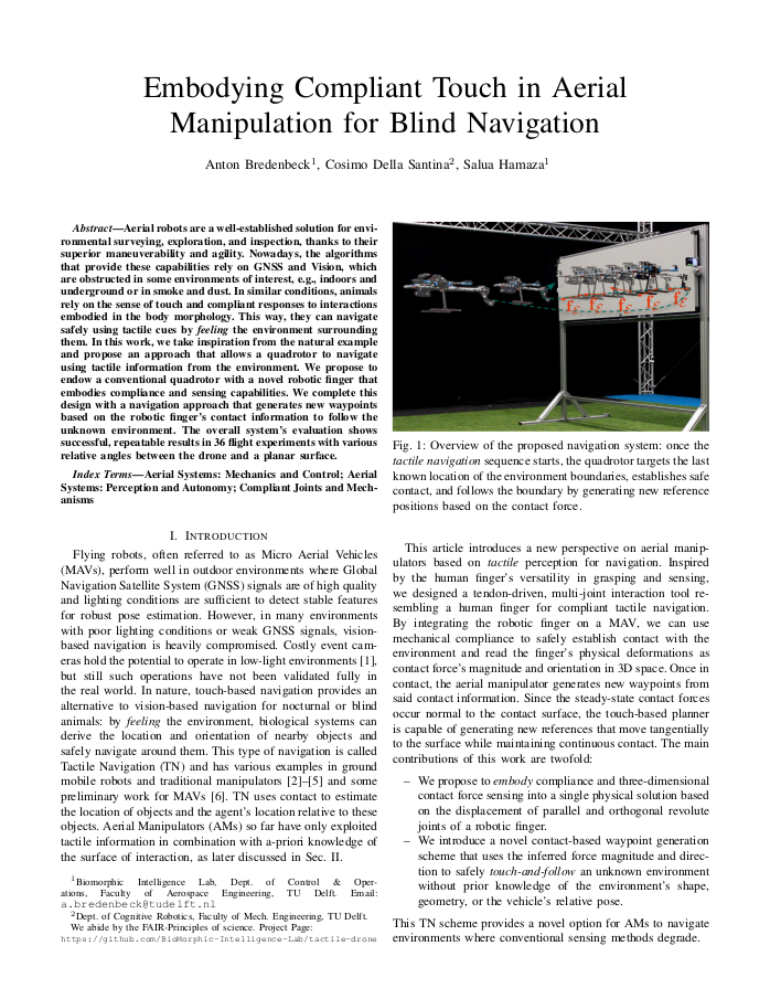 TL;DR: We equip a conventional quadrotor with a compliant, finger like sensing tool. Using contact forces infered from the finger joint displacements we enable the MAV to safely navigate in unknown environments.