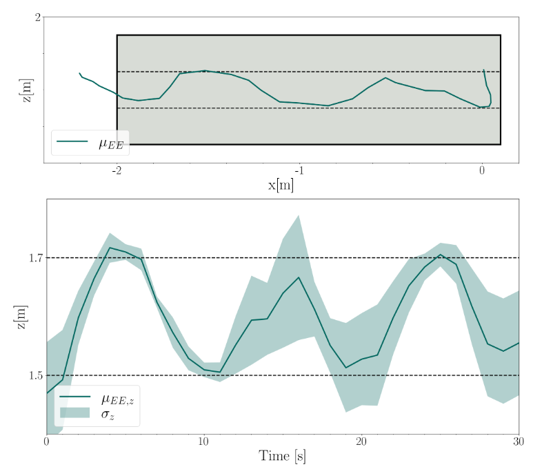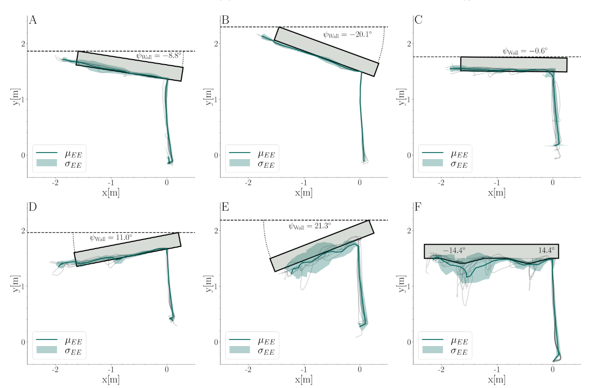 In a total of 36 flight experiments we show that the UAV is capable of successfully navigating unknown environments of varying shape and orientation relying solely on the sense of touch. The figure below (left) showcases all trials for various relative angles of the environment, the average path taken and its standard deviation. We can see that we can successfully handle unknown environments of changing shape and relative angles up to \(20^\circ\). Albeit the performance being best at low relative angles. Furthermore, the figure below (rigth) shows that we can also handle superimposed tasks, such as varying the altitude while using the tactile navigation approach.