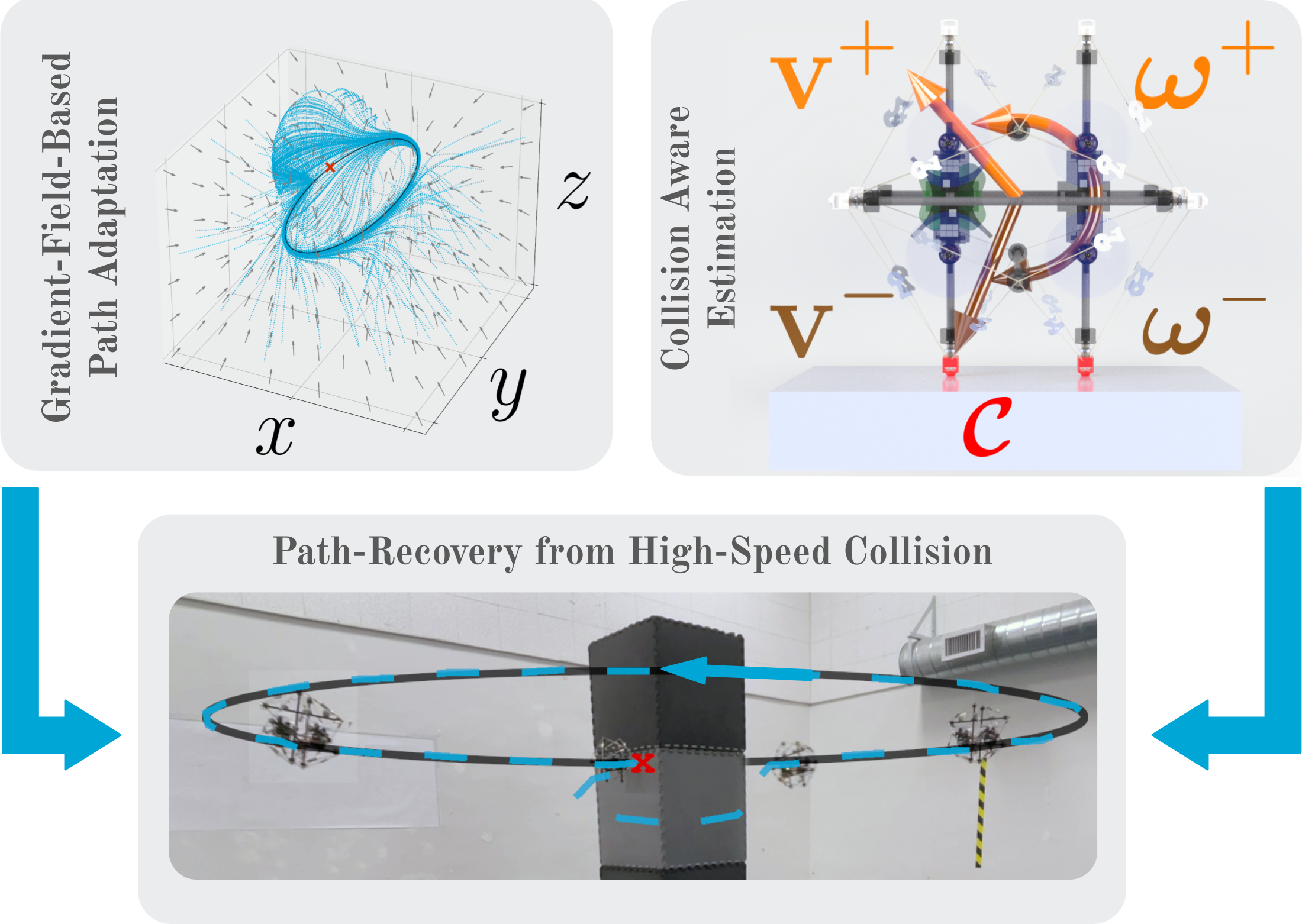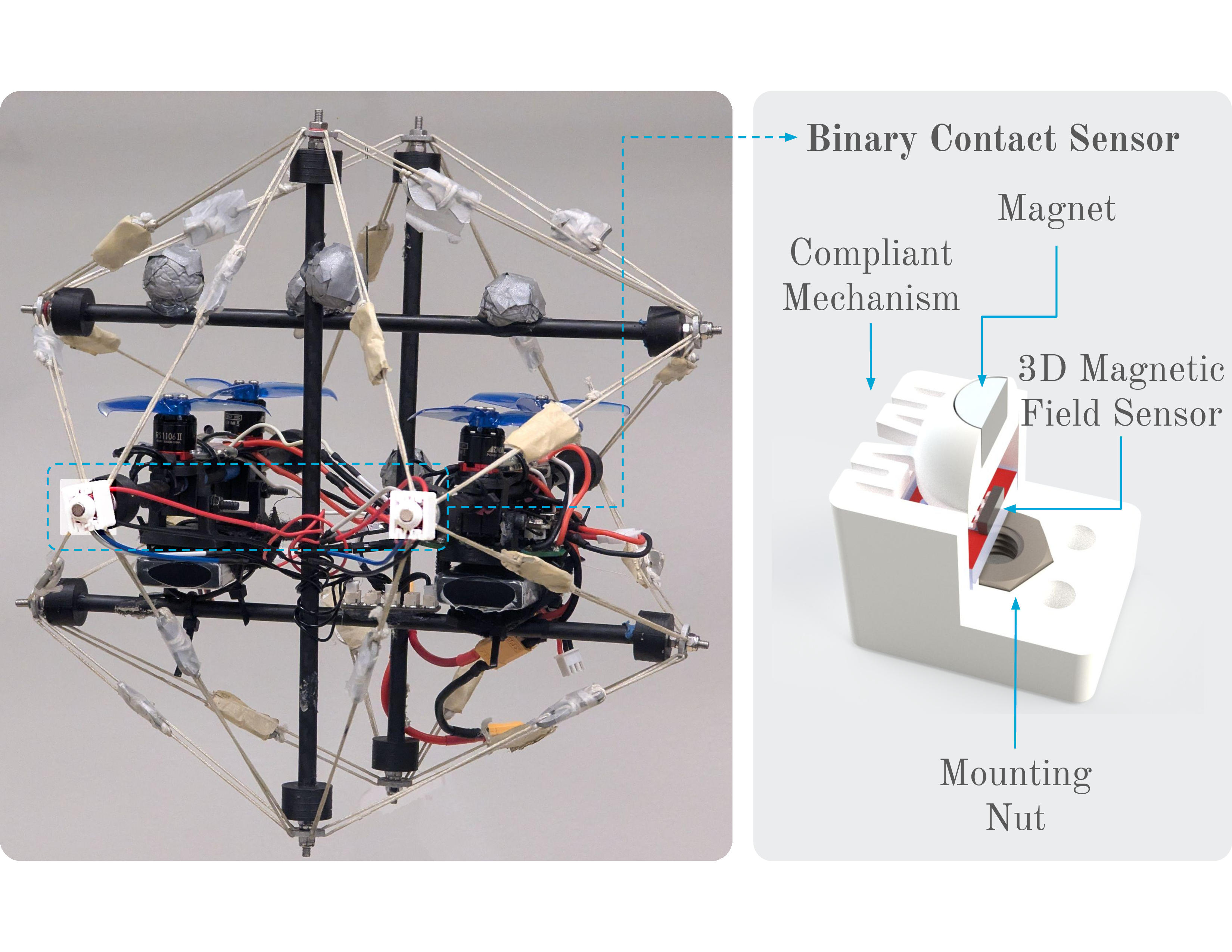 TL;DR: We equip a collision resilient quadrotor with binary contact sensors. Based on the pre-collision velocities, rates and collision points we predict the post collision velocities and rates which improves state-estimation through contact. Based on the improved state estimation and knowledge about where in the world frame the collision occured, we show improved collision recovery and path adaptation behavior.