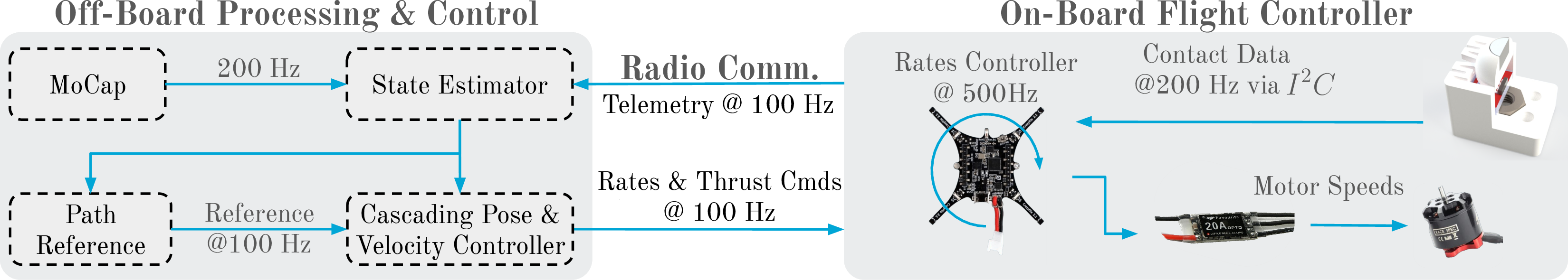 The model used is the conventional quadrotor, with its CoM encased in a protective icosahedral shell. In free flight, the system dynamics follow the standard equations of motion for a quadrotor. $$ \begin{align} \ddot{\mathbf{p}} &= m^{-1} \mathbf{f}_M + \mathbf{g}\\ \dot{\mathbf{\omega}} &= \mathbf{I}^{-1} (\mathbf{\tau}_M - \mathbf{\omega}\times\mathbf{I}\omega) \end{align} $$ The vehicle is controlled using a cascaded control approach whereby a position reference is converted into an acceleration reference, which is then translated into total thrust and attitude commands. These are subsequently tracked by a rate controller. % We assume that contact can only occur at the twelve vertices of the icosahedral shell, with the vertices treated as point contacts. Sensors detect the contact as a binary signal \(\mathbf{\mathcal{C}}\). Following an impulse-based collision modeling approach, we assume that the collision causes an instantaneous change in momentum, governed by a coefficient of restitution \(e\)and a friction coefficient \(\mu\). % For a single vertex \(i\) with the pre-collision velocity \(\mathbf{v}_{i}^- = \mathbf{v} + \mathbf{\omega}\times(\mathbf{\Omega}\mathbf{r}_i)\) the impulse \(\mathbf{j}_i\) is: $$ \begin{align} \mathbf{j}_i &= -\frac{(1+e)\langle\hat{\mathbf{n}} | \mathbf{v}_{i}^{-1}\rangle}{m^{-1} + \langle\hat{\mathbf{n}} | \mathbf{I}^{-1}(\mathbf{\Omega}\mathbf{r}_i \times \hat{\mathbf{n}})\times\mathbf{\Omega}\mathbf{r}_i\rangle}\left(\hat{\mathbf{n}} + \mu\hat{\mathbf{t}}\right) \end{align} $$ The surface normal is assumed to align with the tensegrity beam on which the active contact location lies. The friction is modeled as Coulomb, meaning it is active only if it exceeds a static threshold \(\mu_\text{static}\), which is satisfied if there is sufficient lateral velocity. The overall change in linear and angular velocity is then the normalized sum of the contribution of all \(k\) active vertices: $$ \begin{align} \Delta \mathbf{v} &= \frac{1}{k}\sum_{i=1}^k m^{-1} \mathbf{j}_i\label{eq:delta-v}\\ \Delta \mathbf{\omega} &= \frac{1}{k}\sum_{i=1}^k \mathbf{I}^{-1} \left(\mathbf{\Omega}\mathbf{r}_i\times\mathbf{j}_i\right) \label{eq:delta-omega} \end{align} $$ Normalization is required to prevent the introduction of excess energy into the system.