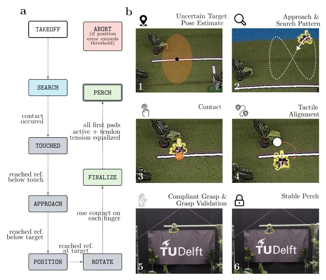 A finite state machine (FSM) governs the perching process: from takeoff and a figure-eight search pattern, through initial contact, approach, orientation alignment using tactile cues, grasp finalization, and passive perching. An abort state ensures safety if errors exceed a threshold.