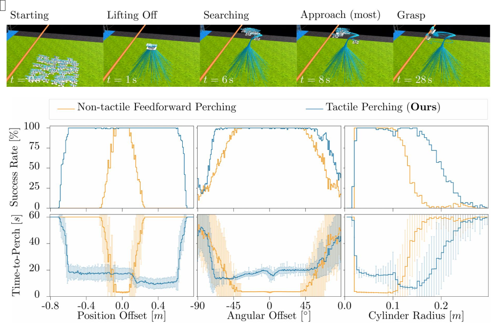 Simulation results comparing feed-forward perching (orange) and tactile perching (blue).