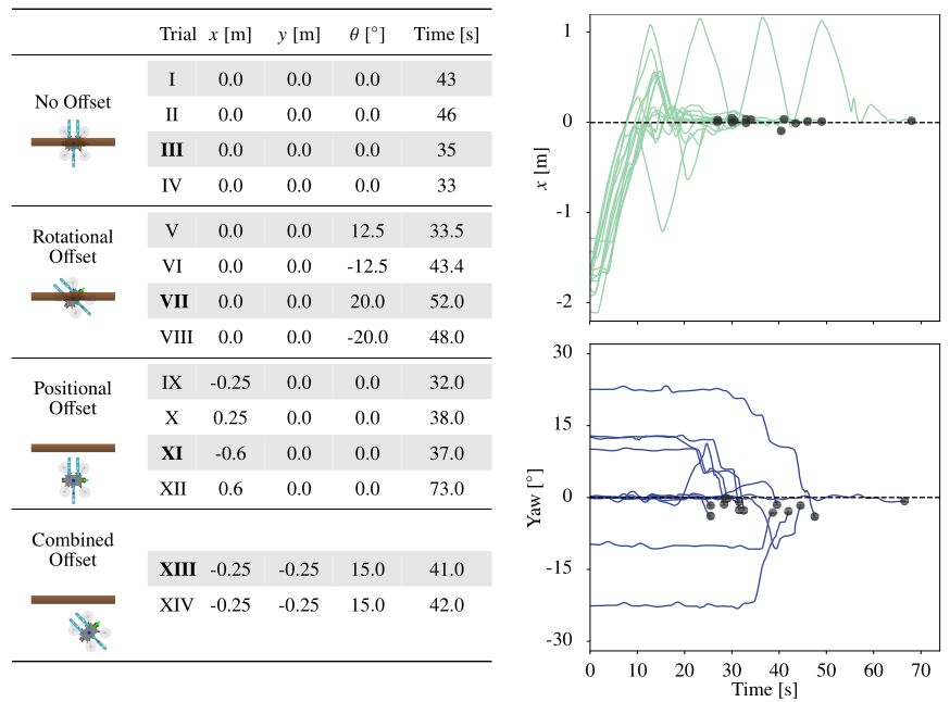 Example trajectories from real-world flight trials with different initial offsets. All trials converge successfully to the target pose in a stable perch indicated by the gray circles.